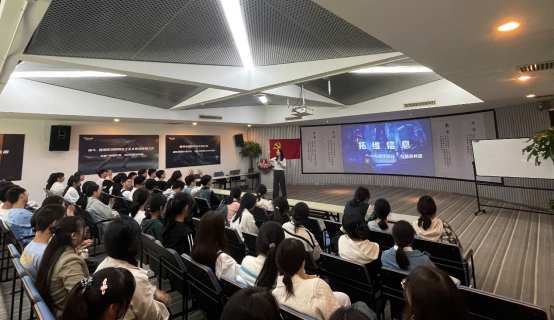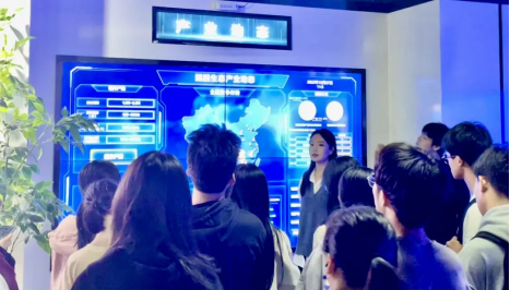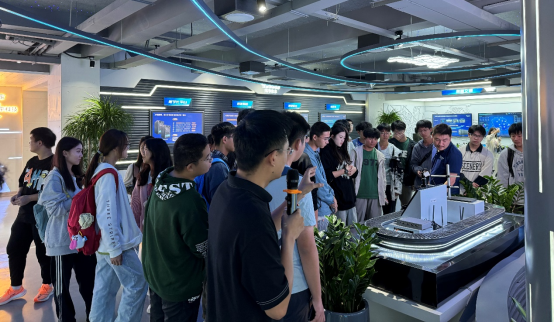 在湖南拓维信息系统公司,学生参观企业展厅,近距离接触智能交通、智能检测产线、智慧教学实验设备等实物产品,与拓维信息的人力资源经理进行了深入的面对面交流。