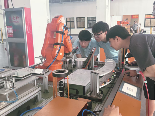 培训首日,学员迅速完成从在校学生到产业实践者的角色转换。在工业机器人实训环节,学员们分组开展程序调试、坐标参数优化等操作训练,当机械臂按照程序指令完成毫米级精度的运动时,智能制造技术的精准性与先进性给学员们留下了深刻印象。通过“做中学”的沉浸式教学模式,学员们在工业机器人编程、自动化生产线调试等专业领域实现了认知深化与技能提升。