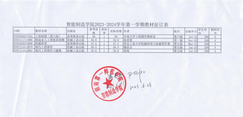 伟德bv1946官网2023-2024学年第一学期教材征订情况公示如下:
