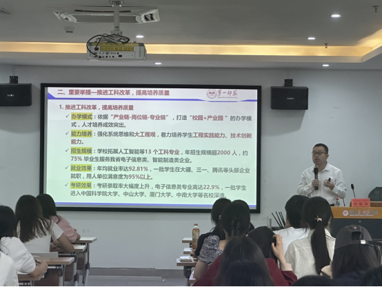 满君丰从人才引进、学科与团队建设、教学与人才培养、科研与技术服务等方面介绍了学院教学资源与教学安排,并深入阐述了工业智能技术的内涵与特点。他指出,科技创新是国家发展的重要部分,大学生应重视基础学科的学习,沉下心来做学问。满君丰强调,作为入党积极分子,要时刻牢记自身使命和责任,勇于担当、敢于创新,为推动工业智能技术发展贡献青春力量。