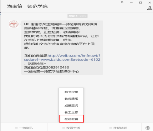 2、进入微信公众号聊天框,点击在【校园生活】选择【在线缴费】。