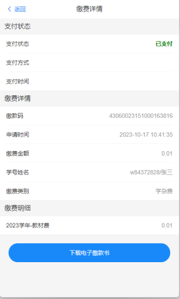 8、选择自己支付的交易记录后点进去,可以查看支付项目明细、下载所需发票。