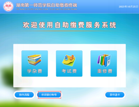 1. 自助缴费终端点击”修改银行卡号 ”